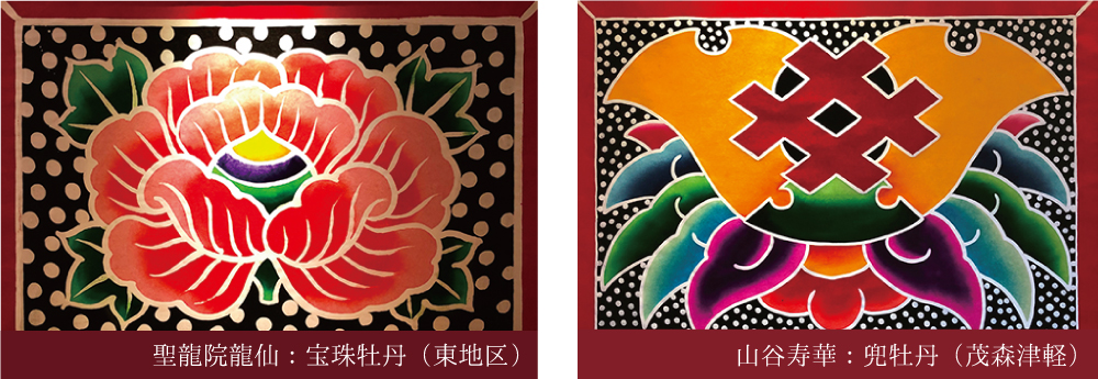 扇ねぷたと美しく調和する「開き」に描かれる牡丹模様は、明治期から広まり、津軽家の紋章をモチーフにしています。