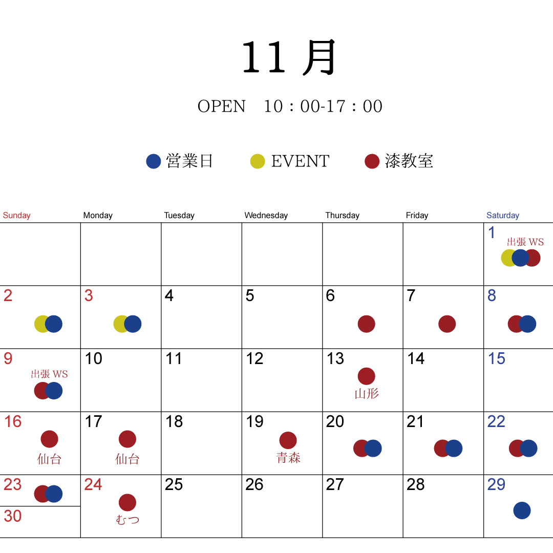 2025.08.01 更新 10月11月12月の営業日 営業日以外は主に工房仕事をしています。 事前にご予約をいただけましたらお買い物や体験可能な日もございますので ご遠慮なくお問合せください。ご来店おまちしております。